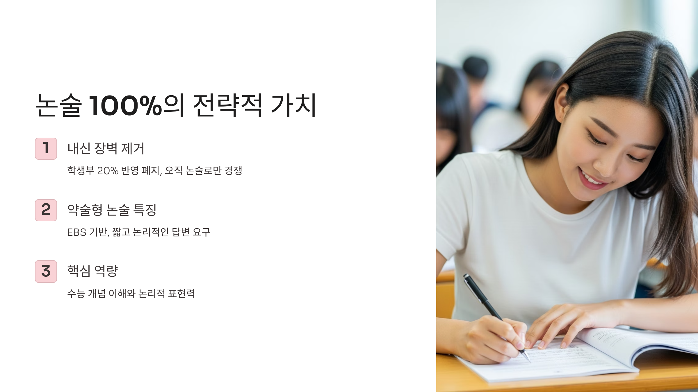 - 논술전형 논술 100% 반영: 기존 논술 80% + 교과 20%에서 논술 100%로 변경되어 내신 성적이 불리했던 학생들에게 새로운 기회가 될 수 있습니다.