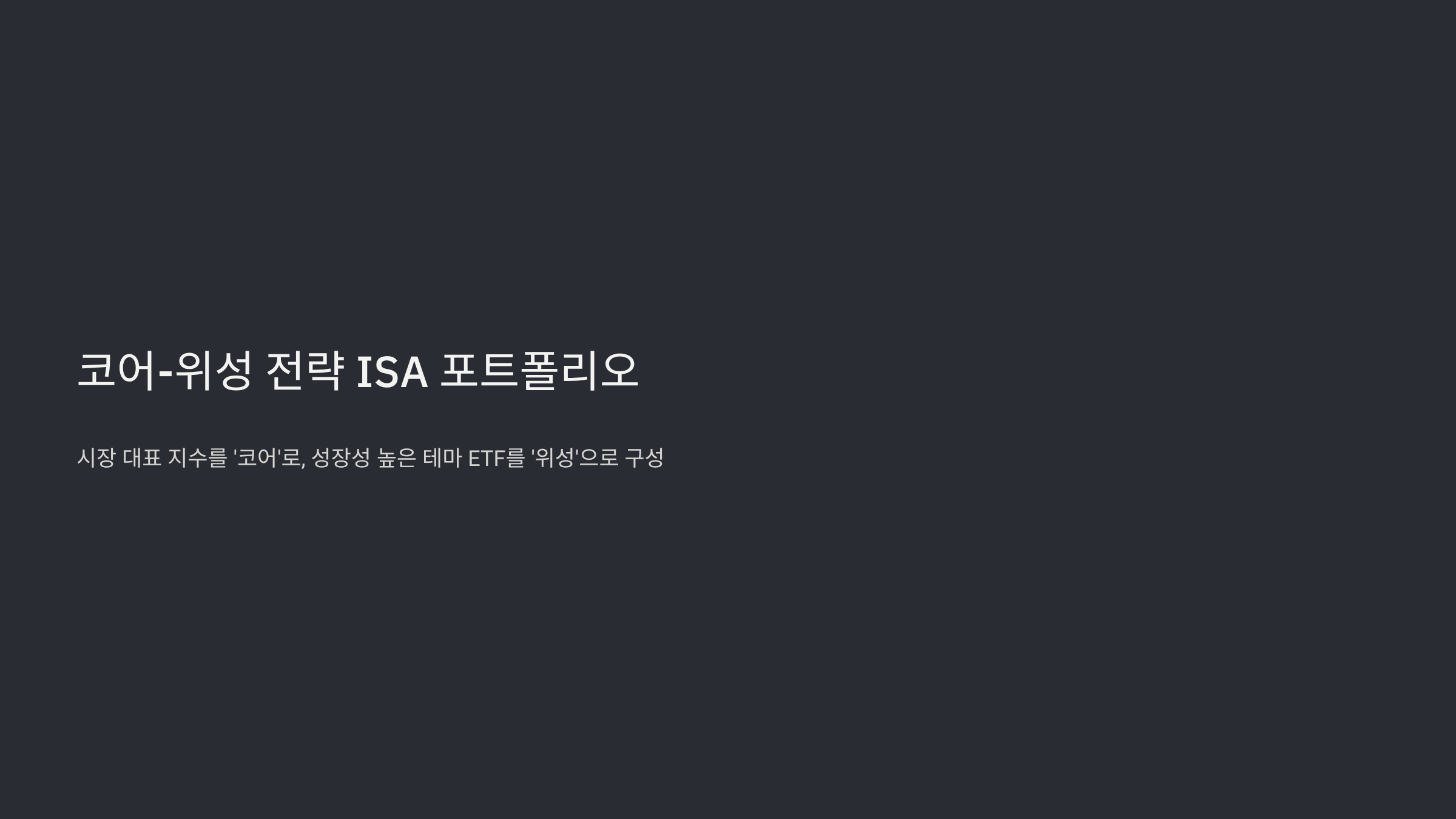 | 코어 (Core) | 글로벌 주식 (TIGER 미국S&P500) | 40% | 포트폴리오의 중심을 잡아주는 핵심 성장 자산. 장기적으로 꾸준한 자본 차익을 추구하며, ISA의 과세이연 효과를 극대화합니다. |