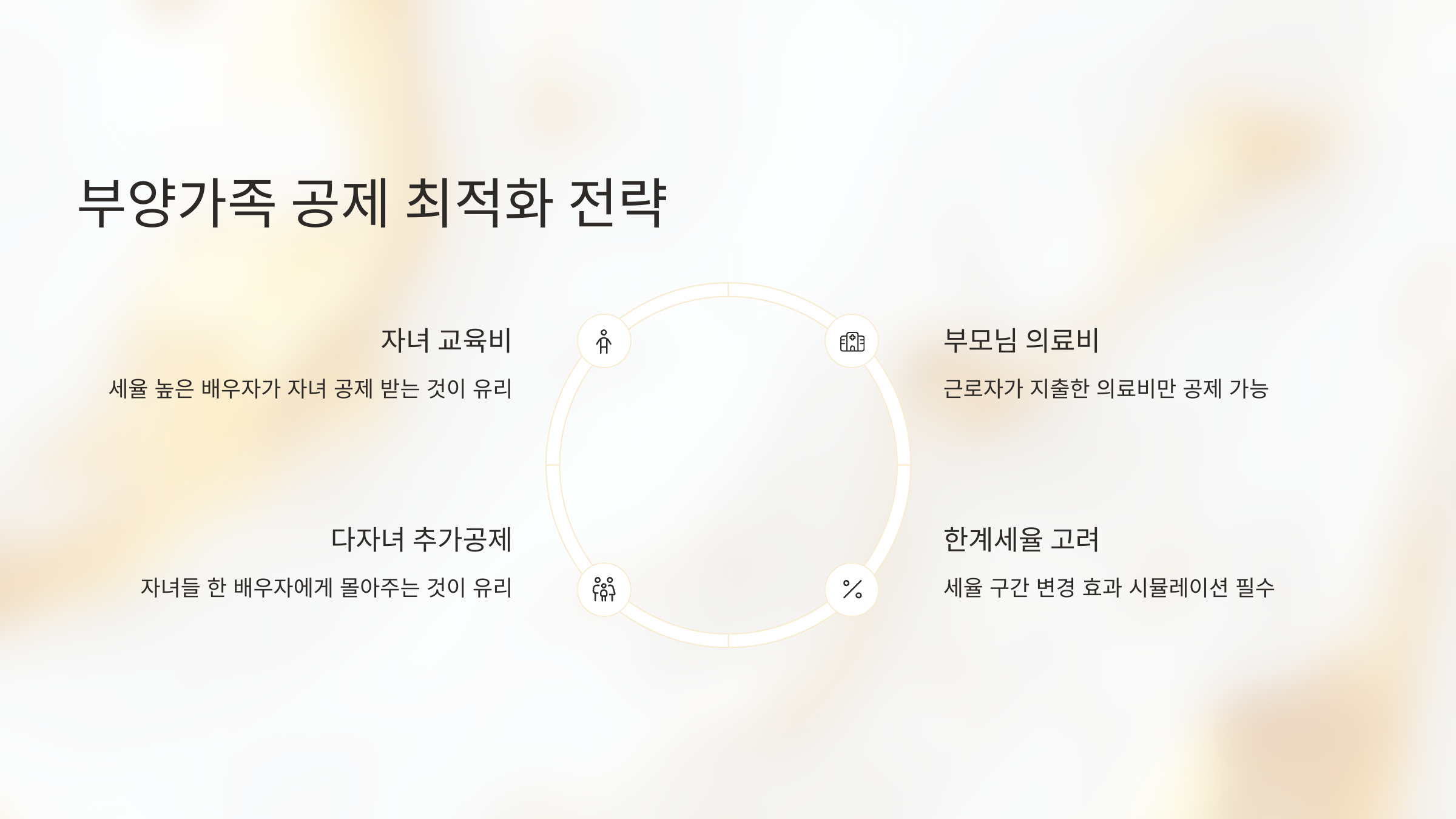 부양가족 공제를 '세율이 높은 배우자에게 무조건 몰아주는 것'이 항상 정답은 아닙니다. 부양가족의 의료비, 교육비 등 지출 패턴과 각 배우자의 한계세율을 종합적으로 고려해야 부부 합산 근로소득세를 최소화할 수 있습니다.