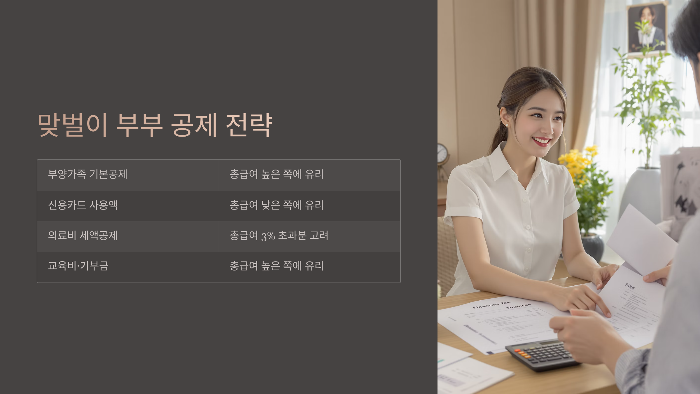 | 의료비 세액공제 | 총급여가 높은 쪽 or 낮은 쪽 | 총급여의 3% 초과 지출분만 공제 가능. 두 사람의 총 지출액과 급여 수준을 모두 고려해 더 많이 공제받는 쪽 선택. | 한 사람이 몰아서 공제받는 것이 일반적으로 유리. |