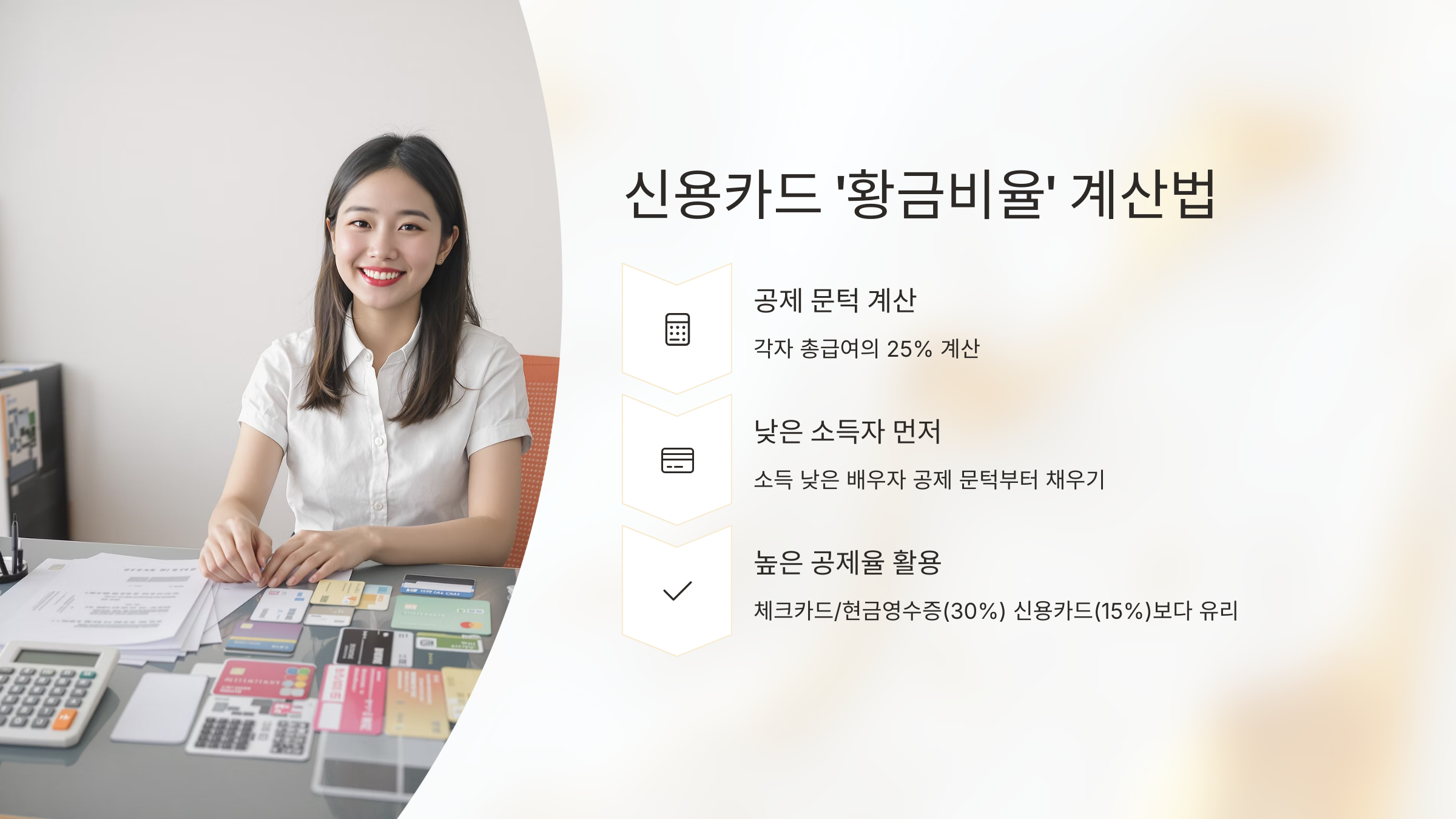 맞벌이 부부 신용카드 소득공제의 핵심은 '총급여의 25%'라는 최저사용금액 기준을 어떻게 넘기느냐에 있습니다. 많은 분들이 단순히 소득이 낮은 배우자에게 몰아주면 유리하다고 알고 있지만, 이는 자칫 두 사람 모두 공제 문턱을 넘지 못하는 비효율을 낳을 수 있습니다. 성공적인 근로소득세 관리를 위해서는 부부의 소비를 계획적으로 배분하여 두 사람 모두의 공제 혜택을 활성화하는 전략이 필요합니다.