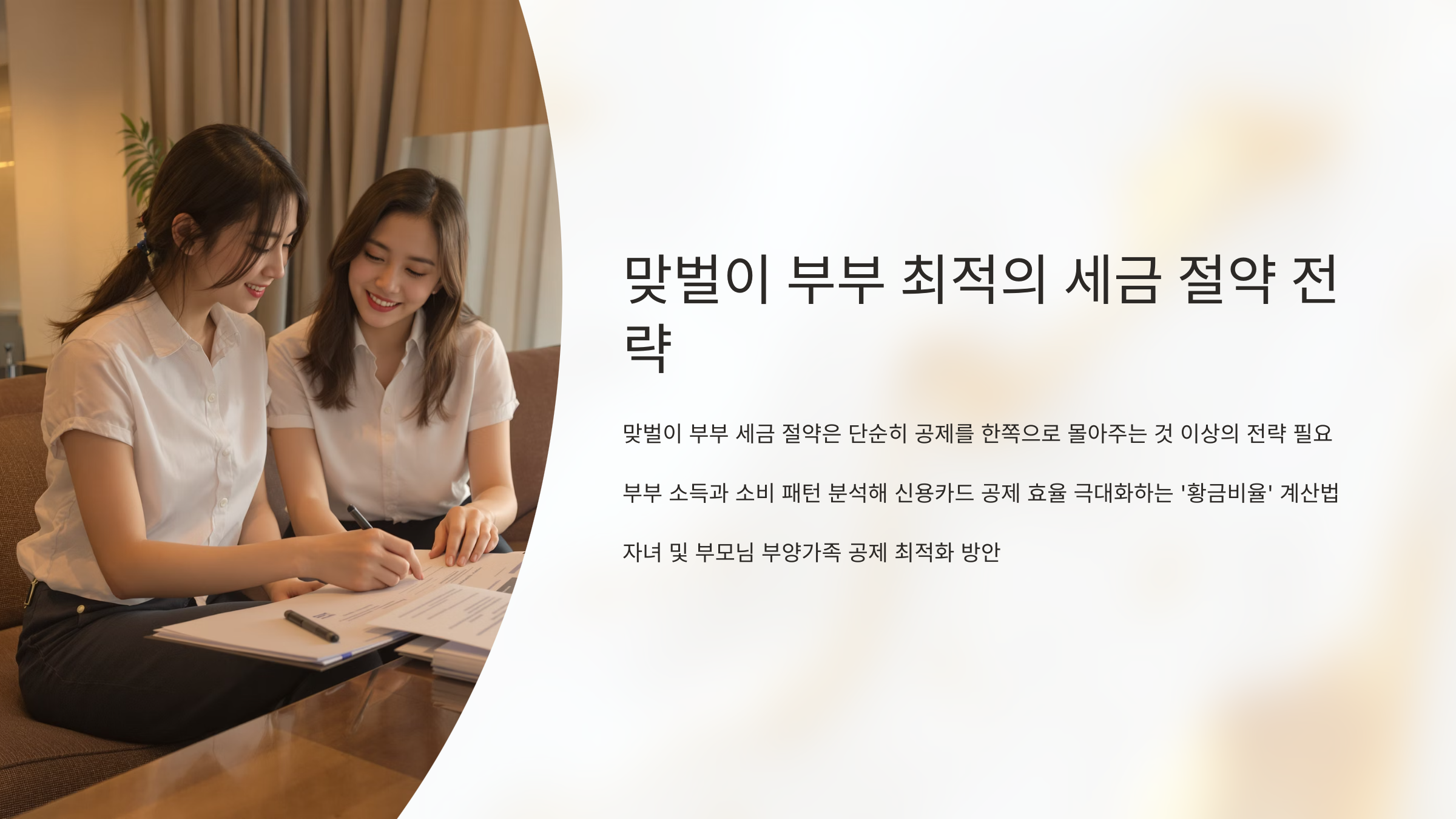 맞벌이 부부 최적의 공제 배분, 근로소득세 연말정산 환급 더 받는 법은 단순히 공제를 한쪽으로 몰아주는 것 이상의 정교한 전략을 요구합니다. 이 글에서는 부부의 소득과 소비 패턴을 분석해 신용카드 공제 효율을 극대화하는 '황금비율' 계산법, 자녀 및 부모님 부양가족 공제의 함정과 최적화 방안, 그리고 시뮬레이션을 통해 부부 합산 근로소득세 부담을 최소화하는 최종 의사결정 프레임워크를 전문가적 시각에서 제시하여, '세테크' 수준을 한 단계 끌어올릴 수 있도록 돕겠습니다.