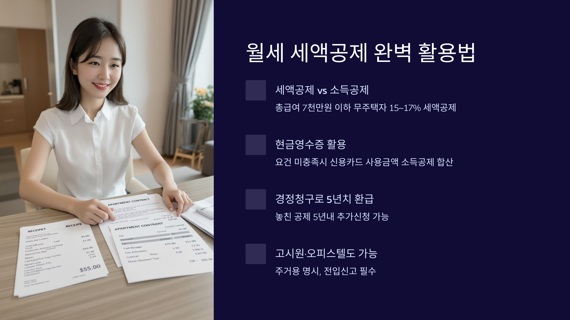 월세 지출은 대표적인 주거비 부담이지만, 세금 혜택을 제대로 받지 못하는 경우가 많습니다. 특히 월세 관련 공제는 '세액공제'와 '소득공제' 두 가지가 있다는 사실부터 알아야 합니다. 총급여 7,000만원 이하 무주택 근로자는 월세액의 15~17%를 세금에서 직접 빼주는 '세액공제'를 받을 수 있습니다. 만약 소득 요건을 초과하거나 주택 규모 기준을 충족하지 못하더라도, 현금영수증을 발급받아 신용카드 등 사용금액 소득공제에 합산하는 '소득공제'를 신청할 수 있으니 포기해서는 안 됩니다.