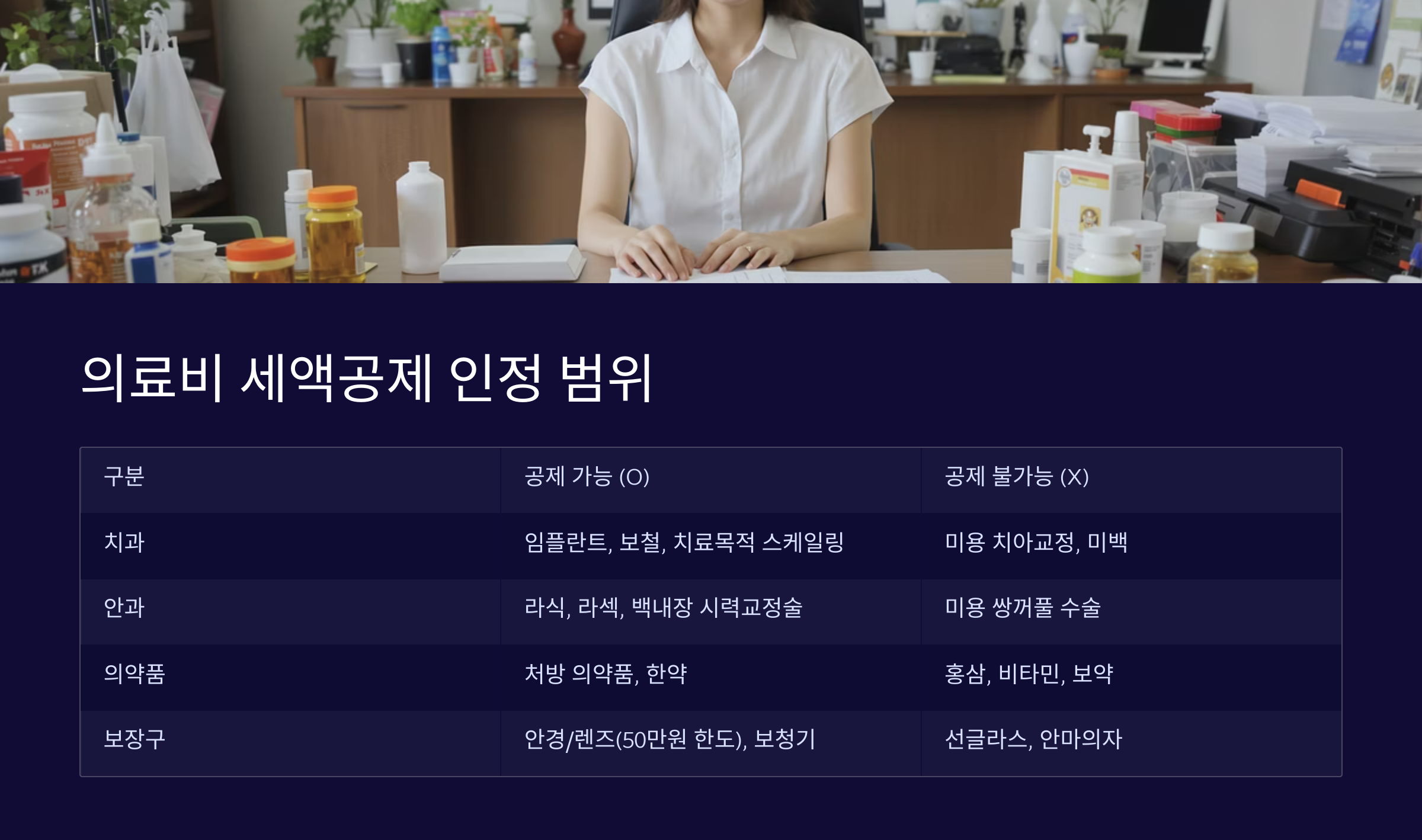 | 의약품 | 의사 처방에 따른 모든 의약품, 한약 | 홍삼, 비타민 등 건강기능식품, 보약 | 처방전, 약제비 계산서 |