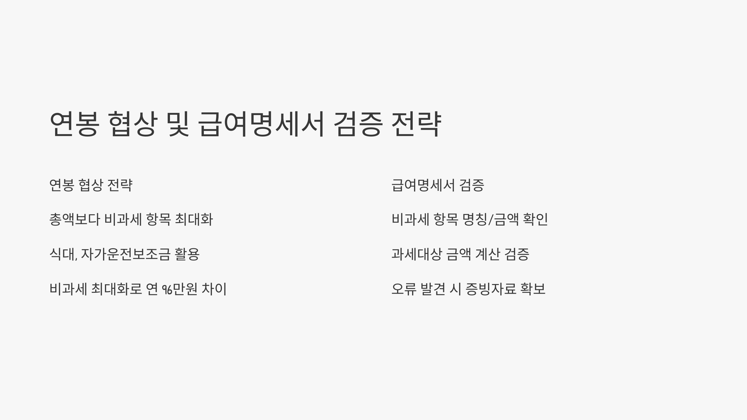 | 비과세 식대 | 0원 (현물 식사 제공) | 200,000원 | 연봉 계약 시 식대 별도 명시 및 현물 식사 미제공 조건 (20만원 한도) |
