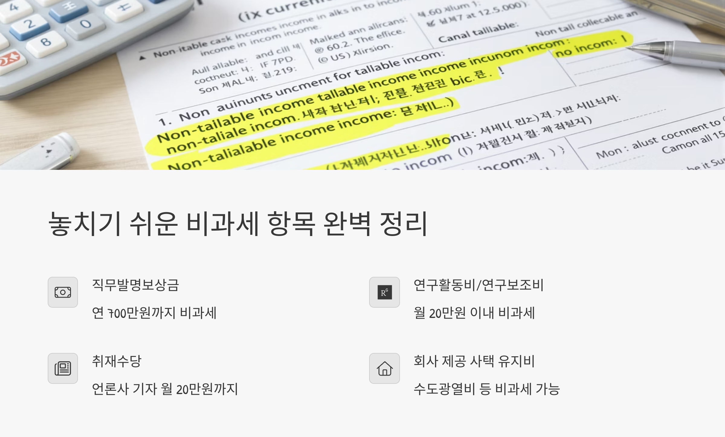 다음은 상대적으로 덜 알려졌지만, 조건만 충족한다면 절세에 큰 도움이 되는 비과세 항목들입니다.