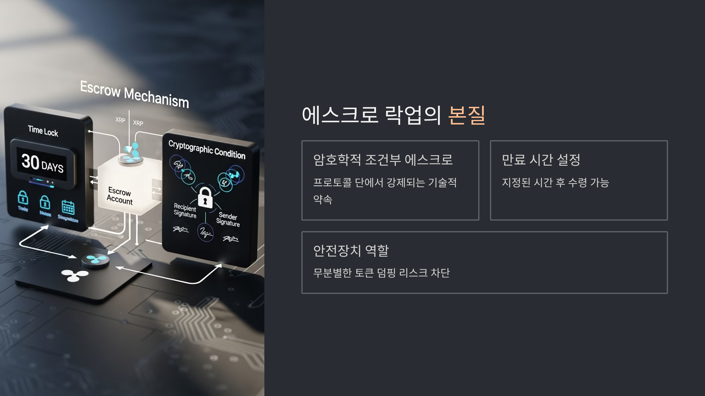 이 에스크로 계약에는 만료 시간(FinishAfter)이 설정되어 있어, 지정된 시간이 지나야만 수취인(리플사)이 XRP를 수령할 수 있습니다. 매월 10억 개가 해제되는 것은 바로 이 만료 시간이 도래했음을 의미합니다. 이러한 투명하고 강제적인 메커니즘은 기관 투자자나 파트너사들이 리플 생태계에 참여할 때 발생할 수 있는 '창립사의 무분별한 토큰 덤핑' 리스크를 원천적으로 차단하는 안전장치 역할을 합니다.