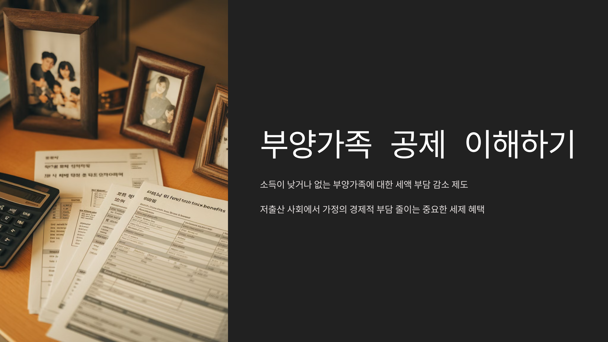 부양가족 공제는 개인의 세액 부담을 줄이기 위해 소득이 낮거나 없는 부양가족에 대해 연말정산 시 소득에서 일정 금액을 공제하는 제도입니다.