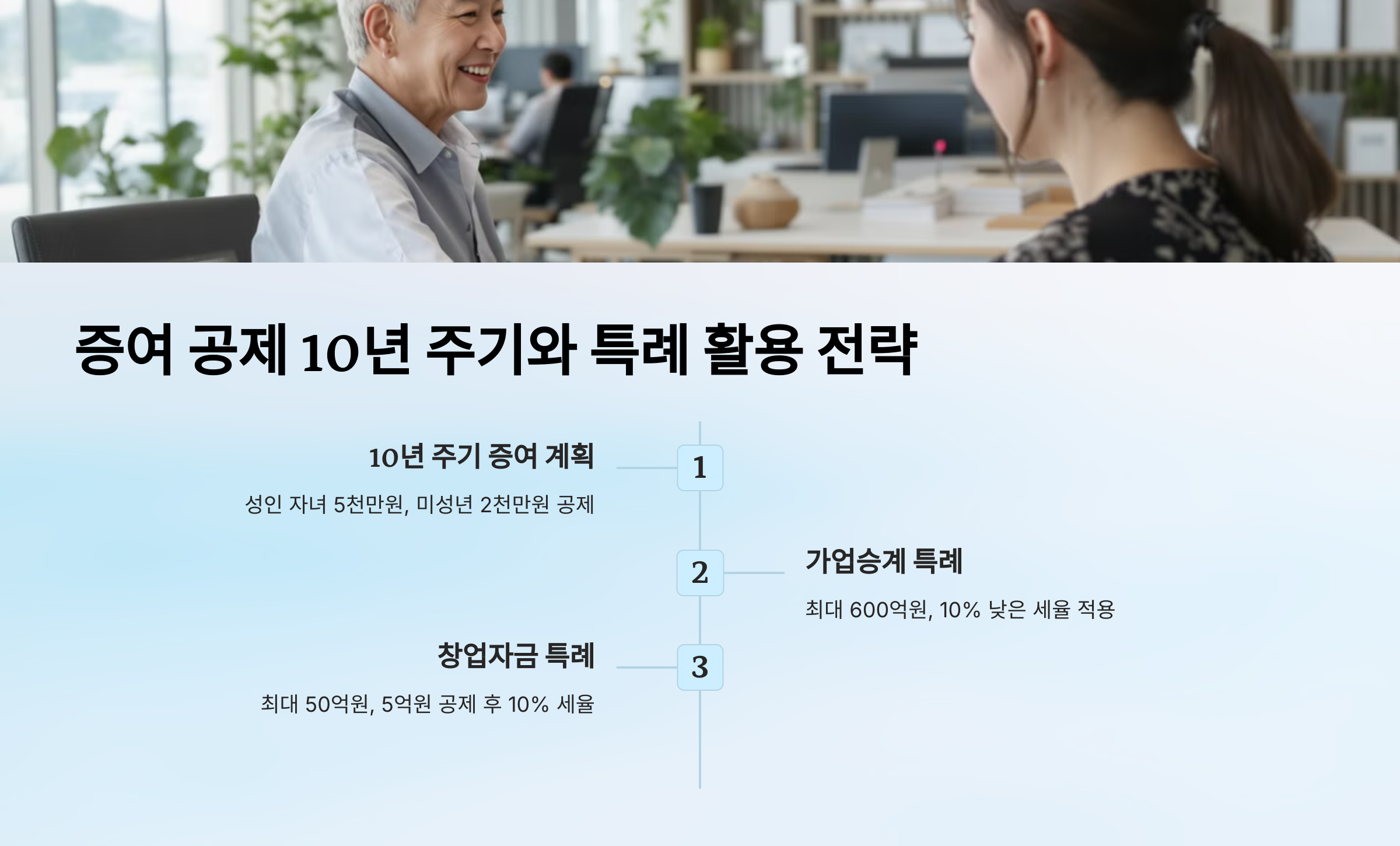 - 창업자금 특례: 최대 5억원 공제 (증여세 10% 저율 과세, 상속 시 합산)