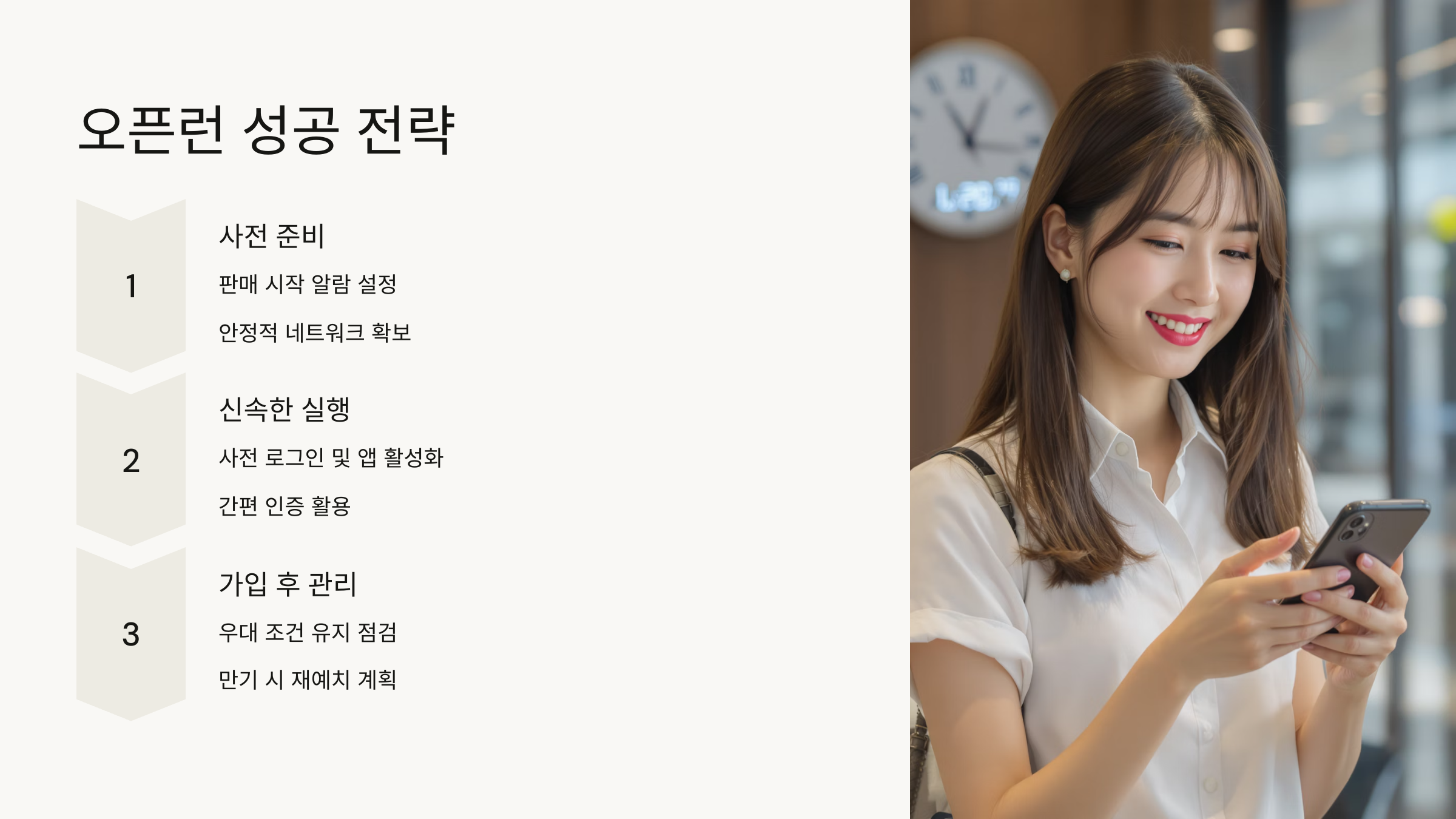 - '오픈런' 전략 활용: 인기 특판 상품은 판매 개시 직후 빠르게 마감될 수 있습니다. 판매 시작 시간을 정확히 인지하고, 해당 시간에 맞춰 즉시 가입을 시도하는 '오픈런' 전략이 때로는 유효합니다.