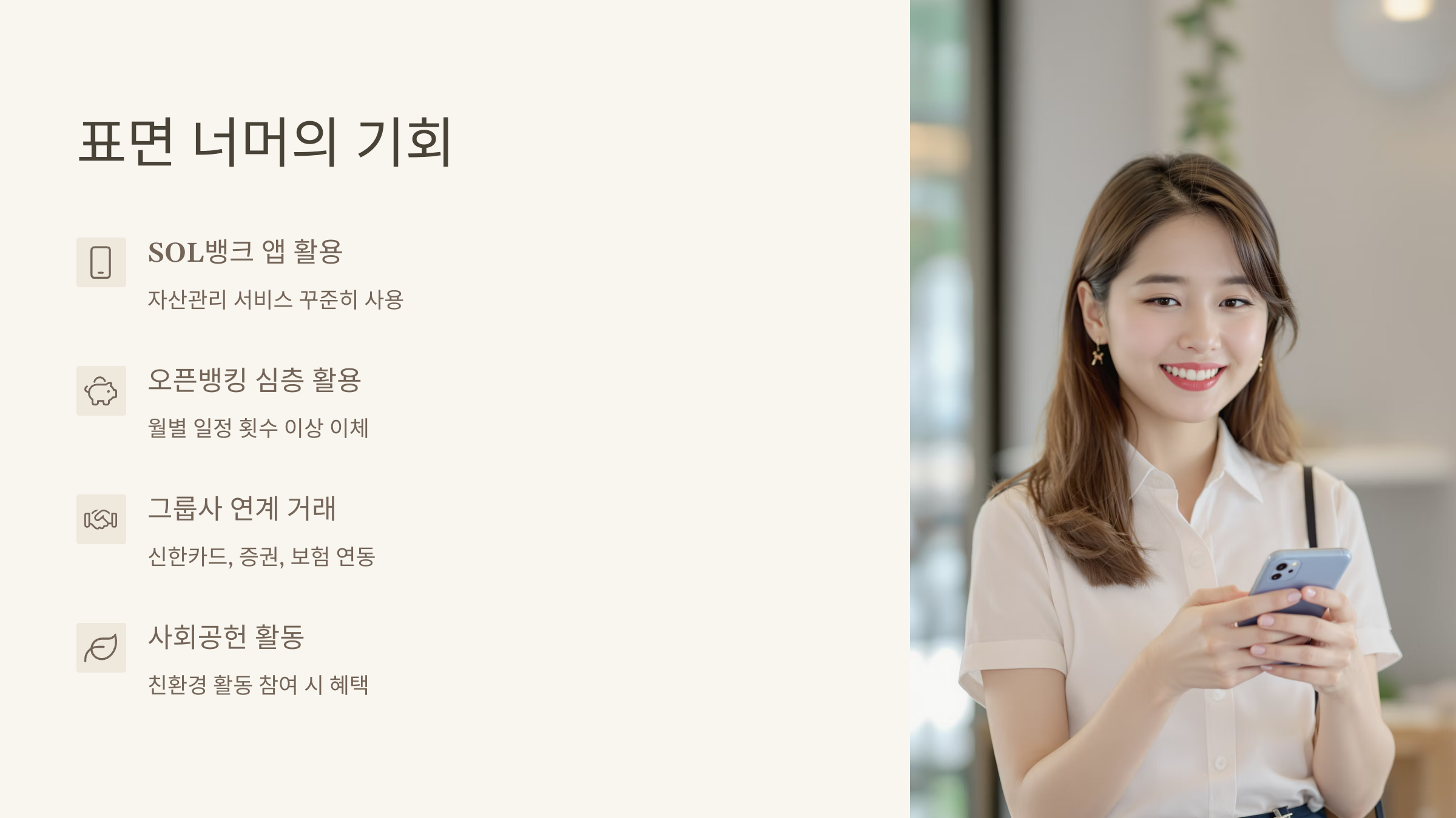 | SOL뱅크 특정 기능 활성 사용 (MY자산 등) | 앱 내 안내 확인, 월별 사용 빈도/기간 충족 | ~ 0.1% (쿠폰/포인트) | 꾸준한 사용 필요, 대상 기능 명확히 확인 |