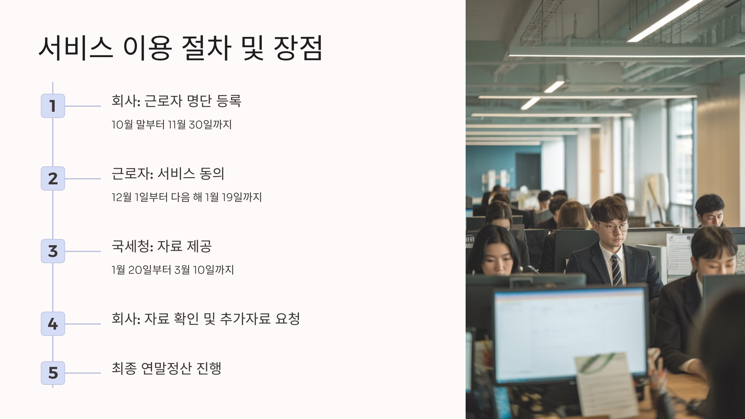 | 5단계 | 회사 | 연말정산 실시 | ~3월 10일 | 최종 정산 완료 |