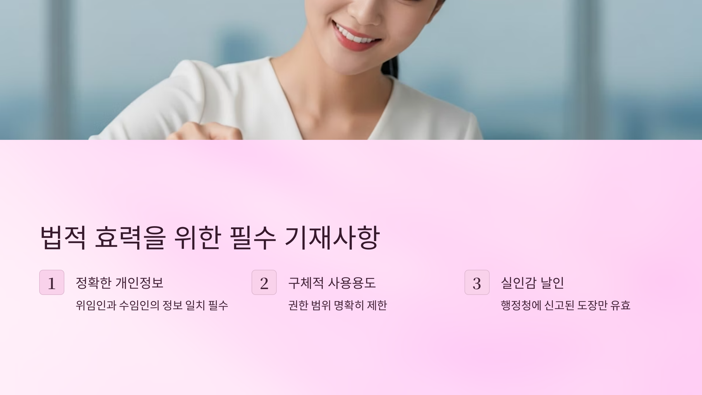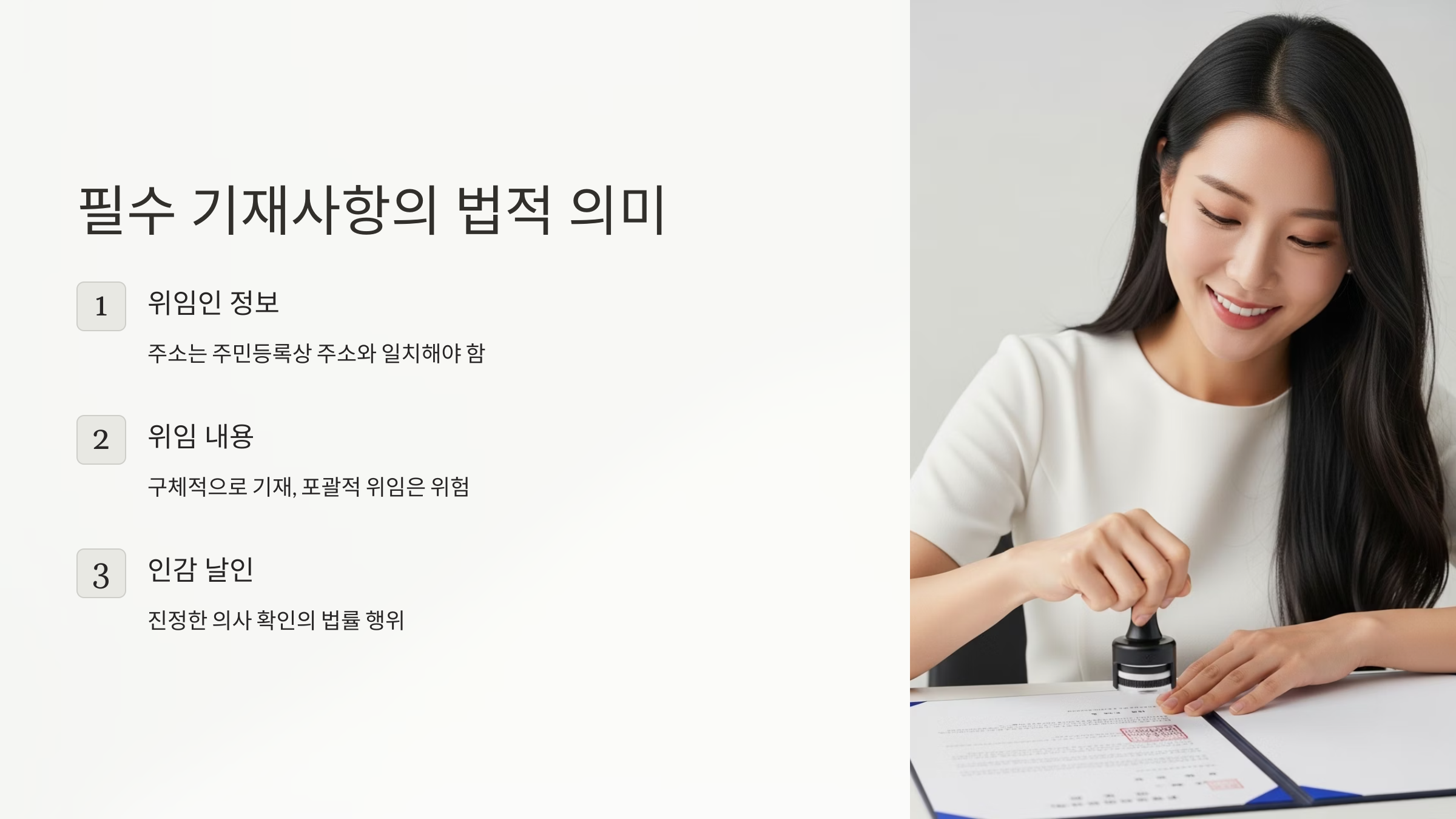 - 임의적 수정: 기재 사항을 틀렸을 때 수정액이나 수정테이프를 사용하거나, 정정 날인 없이 임의로 내용을 고친 경우. 모든 수정은 해당 부분에 두 줄을 긋고 그 위에 위임인의 인감도장을 다시 날인해야 합니다.