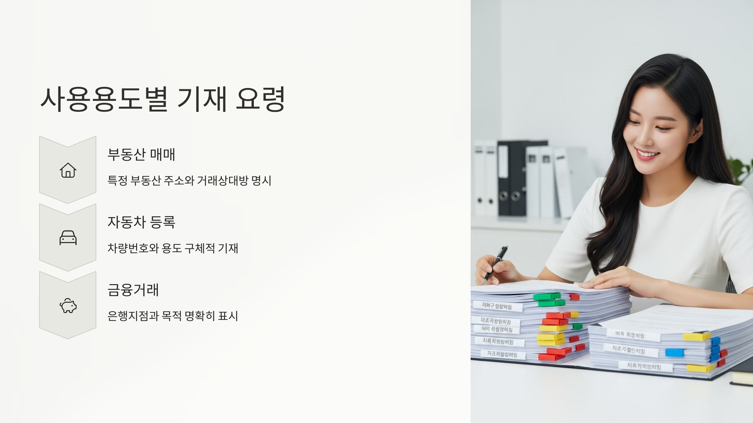부동산 거래와 같이 중대한 재산권 변동이 따르는 경우, 단순히 '부동산 매매용'이라고 쓰는 것을 넘어, 대상 부동산의 주소와 거래 상대방까지 특정하는 것이 가장 안전합니다. 이는 대리인이 해당 부동산 거래 외 다른 목적으로 인감증명서를 사용하는 것을 불가능하게 만듭니다. 효과적인 인감증명서 위임장 작성을 위해, 아래 표와 같이 사용용도별 기재 수준을 구체적으로 이해하고 활용해야 합니다.