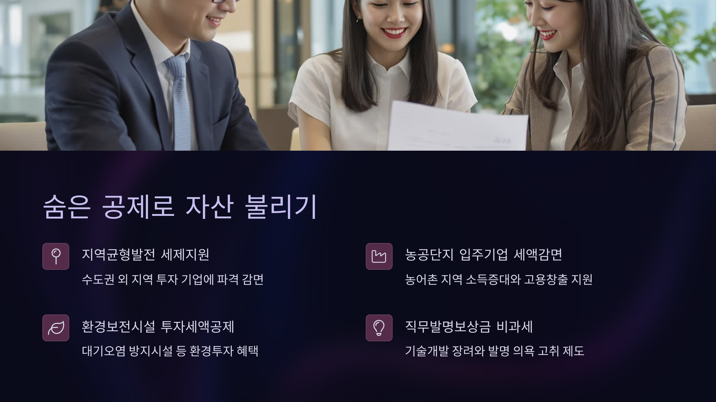 - 농공단지 입주기업 등에 대한 세액감면: 농어촌 지역의 소득 증대와 고용 창출을 위해 농공단지에 입주하여 특정 사업을 영위하는 중소기업에 대해 법인세 또는 소득세를 감면합니다.