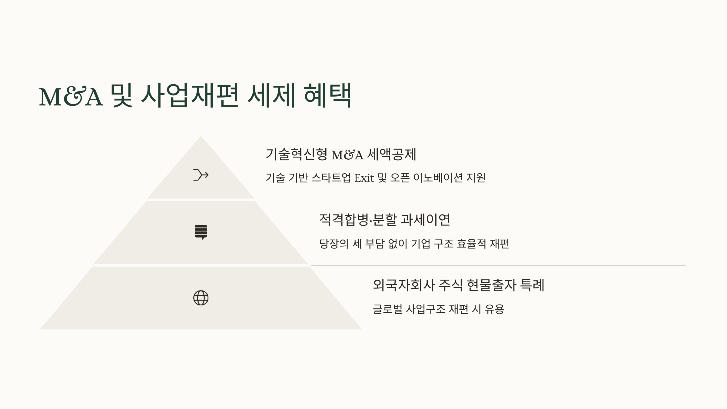 대표적인 예로 ‘적격합병·분할·현물출자·주식의 포괄적 교환·이전’에 대한 과세특례가 있습니다. 이는 일정한 요건을 충족하는 구조조정 거래에 대해 양도차익이나 의제배당 등에 대한 법인세 또는 소득세 과세를 이연시켜주는 제도입니다. 당장의 세 부담 없이 기업 구조를 효율적으로 재편할 수 있도록 지원하는 것입니다. 특히, 기술혁신형 중소기업 간의 M&A에 대해서는 추가적인 세액공제 혜택을 제공하여 기술 기반 기업의 성장을 촉진하고 있습니다.
