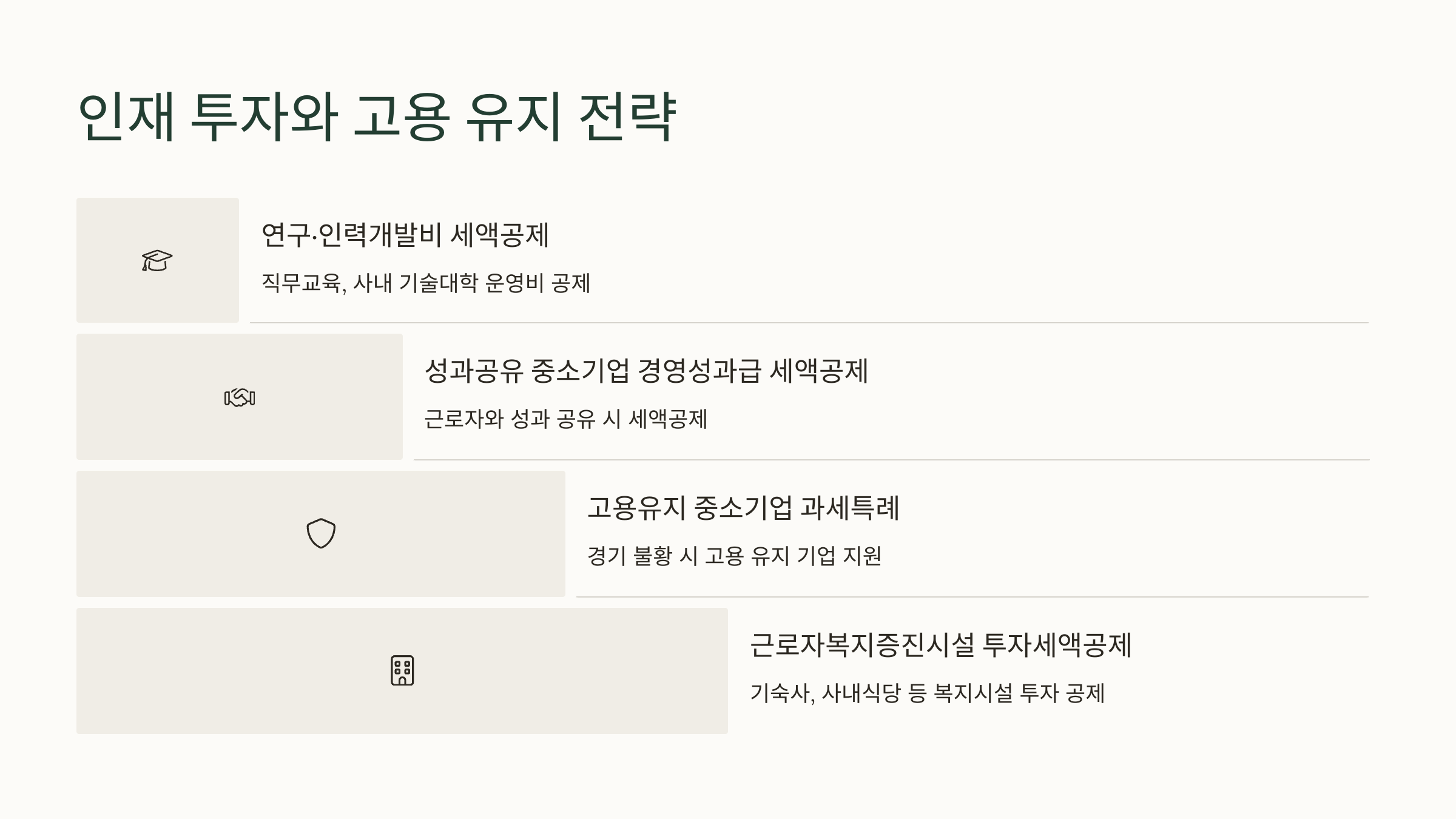 - 근로환경 개선 투자 지원: 장애인 편의시설 설치, 직장어린이집 운영 지원, 근로자 건강증진 시설 투자 등에 대한 세제지원은 근로자 복지 향상과 동시에 기업의 세 부담을 줄여줍니다.