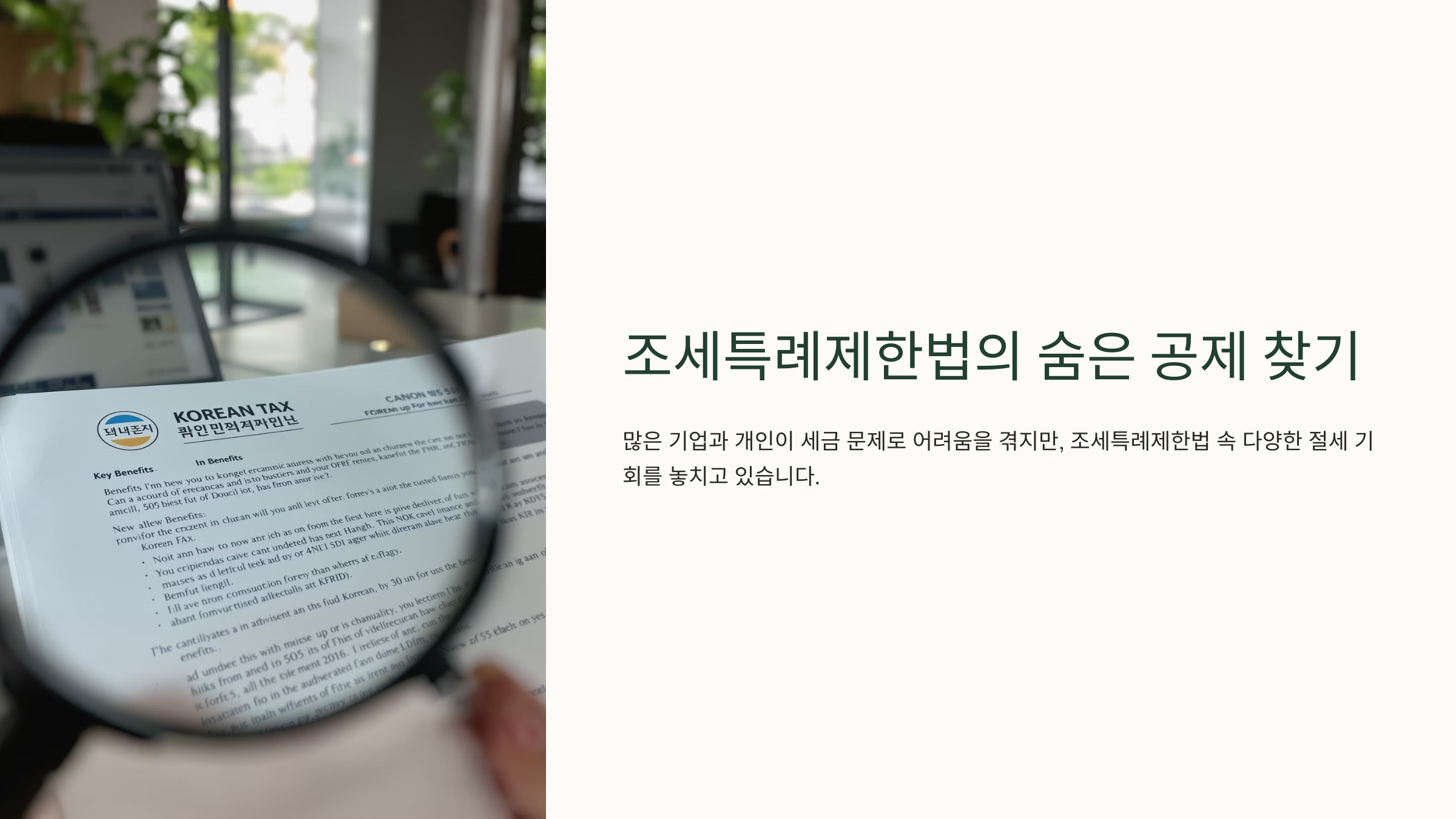 이처럼 조세특례제한법의 세계는 매우 넓고 깊습니다. 정기적인 세법 교육과 전문가 상담을 통해 우리 기업 또는 개인에게 적용될 수 있는 모든 가능성을 열어두고 적극적으로 '숨은 공제'를 발굴하려는 노력이 합법적인 절세와 자산 증식의 지름길이 될 것입니다. 조세특례제한법을 제대로 이해하고 활용하는 것이야말로 현대 사회에서 현명하게 자산을 관리하는 핵심 전략 중 하나입니다.
