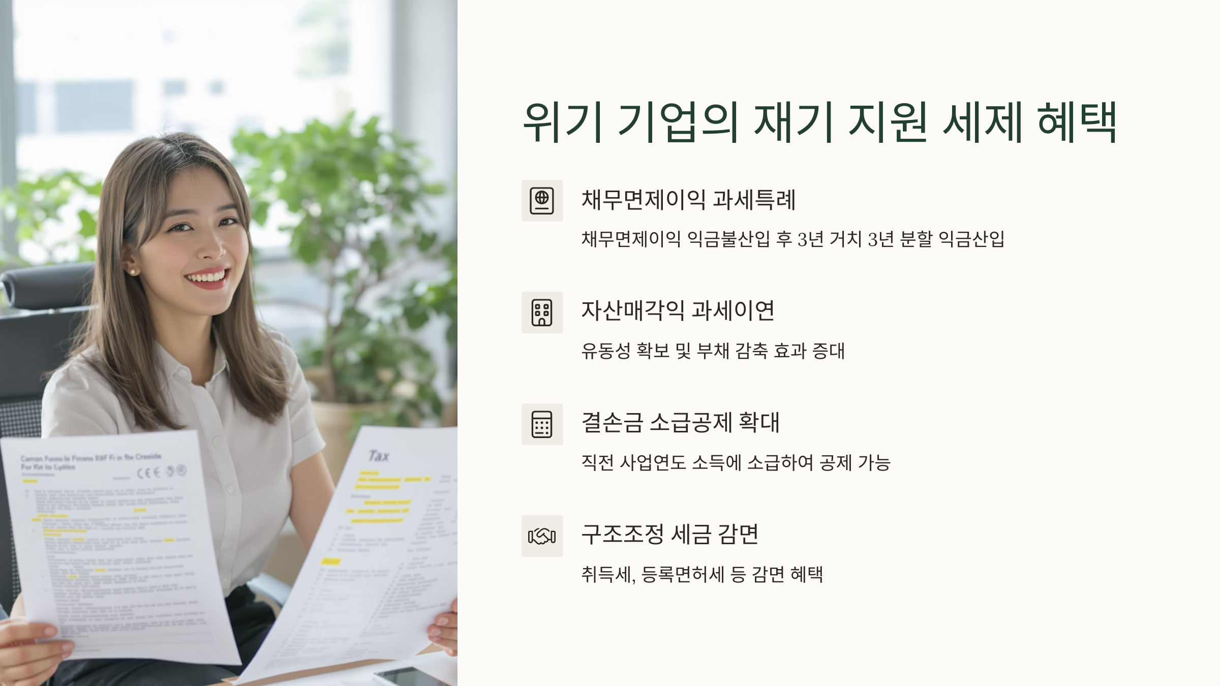 기업이 경영상 어려움에 직면했을 때, 조세특례제한법은 재기를 위한 중요한 발판을 제공할 수 있습니다. 채무조정이나 구조조정 과정에서 발생하는 세 부담을 경감시켜 기업의 회생을 적극적으로 지원하는 규정들이 존재하기 때문입니다. 이러한 혜택은 단순한 세금 감면을 넘어, 기업이 재무 건전성을 회복하고 새로운 성장의 기회를 모색할 수 있도록 돕는 실질적인 동력이 됩니다.