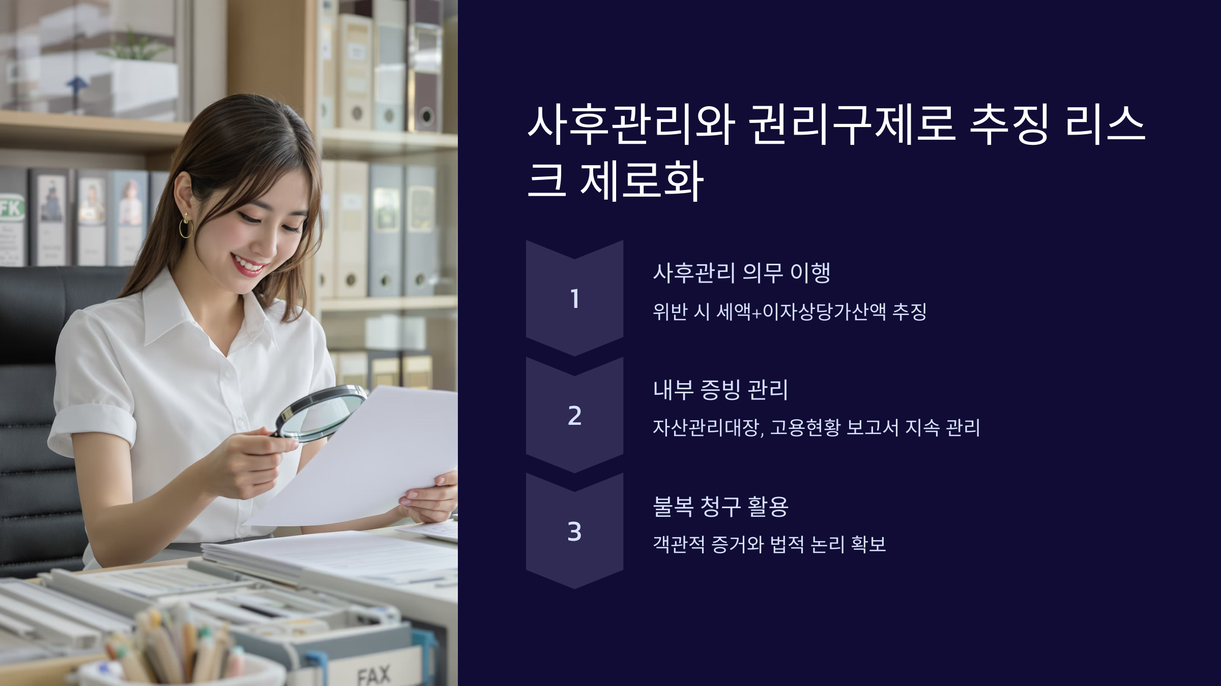 - 사후관리 요건 철저 분석 및 준수: 대부분의 주요 세액공제·감면에는 사후관리 요건이 따릅니다. 예를 들어, 투자세액공제를 받은 자산을 일정 기간 내에 처분하거나 임대하는 경우, 고용증대 세액공제를 받은 후 고용 인원이 감소하는 경우 등에는 이미 공제받은 세액과 이자상당액을 추징당할 수 있습니다. 각 규정별 사후관리 요건을 명확히 숙지하고 이를 준수하기 위한 내부 통제 시스템을 마련해야 합니다.