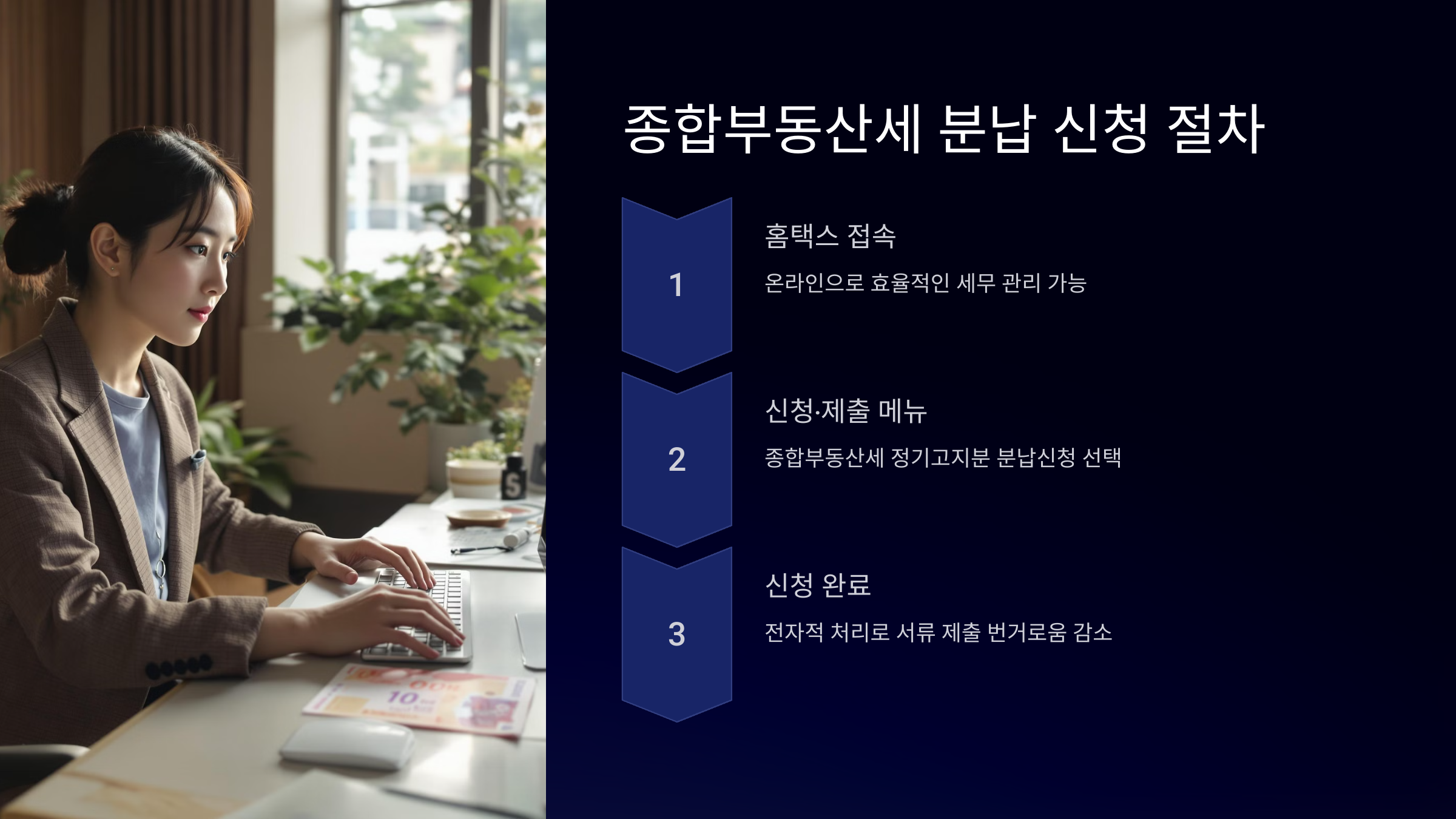 종합부동산세 분납 신청은 홈택스를 통해 전자적으로 가능하며, 이는 효율적인 세무 관리를 위해 매우 중요합니다. 인터넷을 통한 전자신청은 서류 제출의 번거로움을 줄여주고, 처리 속도를 크게 향상시킵니다. 신청을 위해서는 고지서를 받은 후 홈택스에 접속하여 '신청‧제출- 신청업무 - 종합부동산세 정기고지분 분납신청'을 선택하면 됩니다.