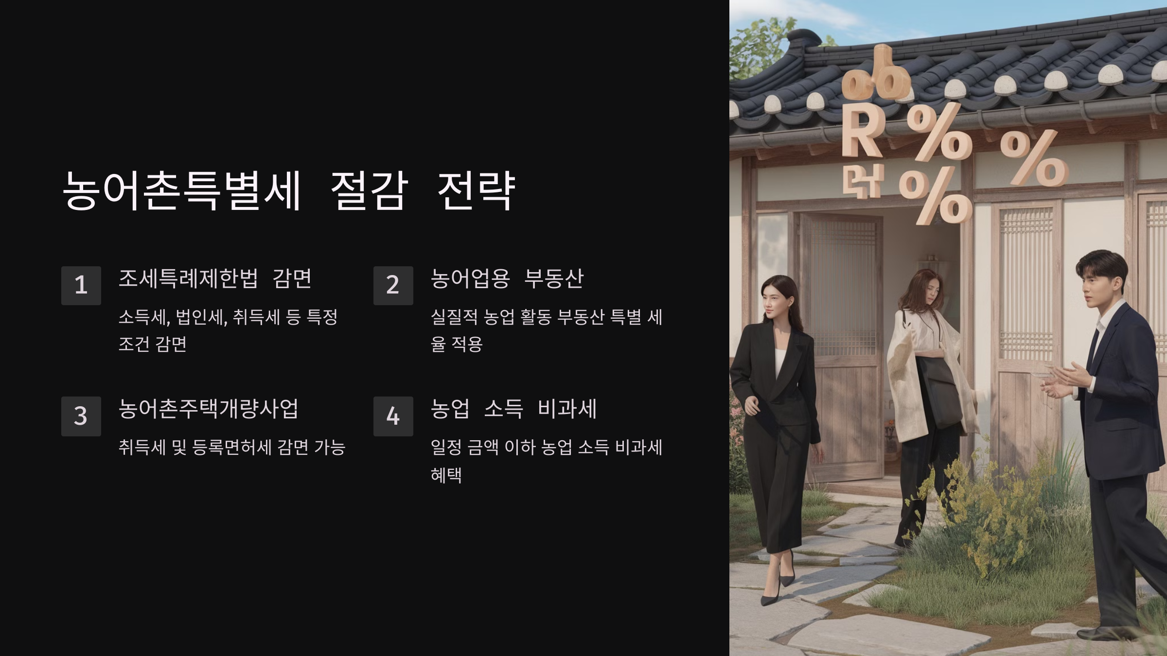 - 농어촌주택개량사업 참여: 관련 사업에 참여하여 취득세 및 등록면허세를 감면받을 수 있습니다.