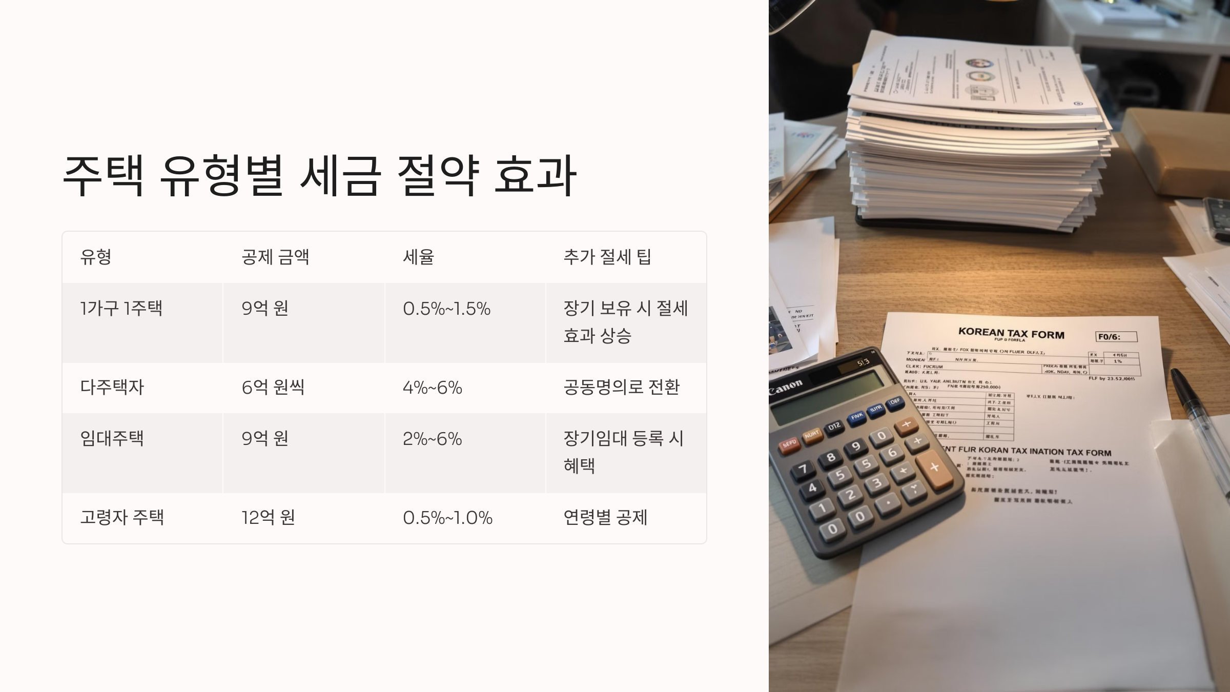 | 1가구 1주택 | 9억 원 | 0.5%~1.5% | 고령자 공제 | 장기 보유 시 절세 효과 상승 |