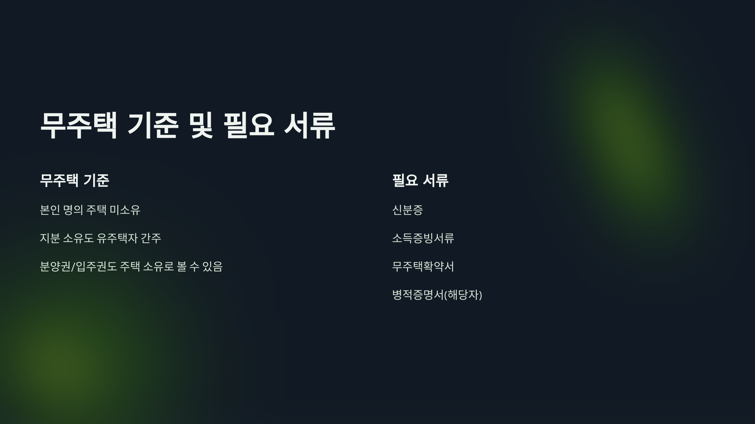 - 상속 및 증여받은 주택: 상속이나 증여로 주택을 소유하게 된 경우에도 원칙적으로 유주택자입니다. 다만, 상속으로 주택의 공유지분을 취득했다가 3개월 이내에 그 지분을 처분한 경우 등 예외적으로 무주택으로 보는 규정이 일부 있습니다.