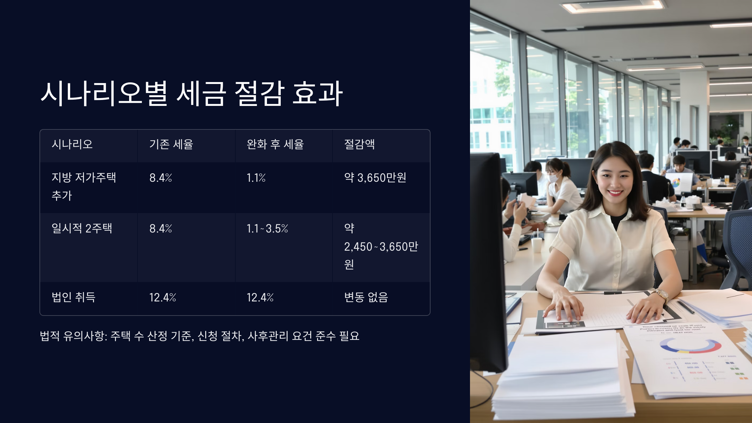 | 사례 3: 법인이 비조정지역 주택 취득 | 주택 없음 | 비조정대상지역 F주택 | 12.4% (법인 중과) | 12.4% (법인 중과 변동 없음) | 변동 없음 |