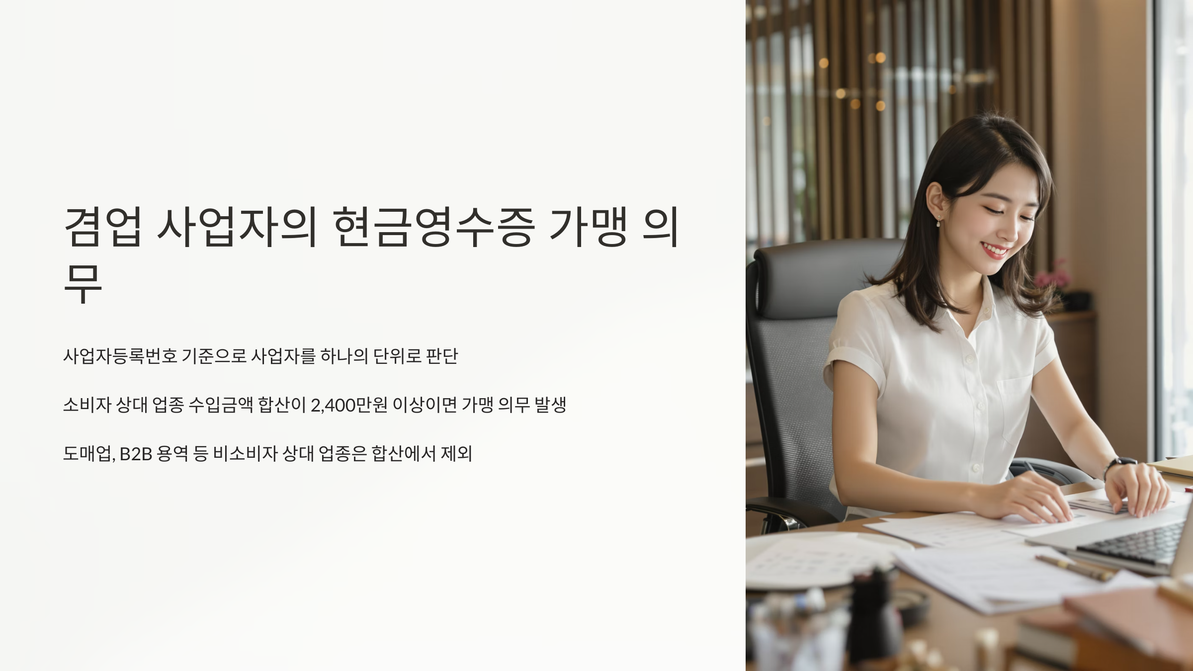 - 핵심: 예를 들어, 소매업 수입금액 1,500만 원과 학원업 수입금액 1,000만 원을 동시에 영위한다면, 합산 수입금액이 2,500만 원으로 2,400만 원을 초과하므로 현금영수증 가맹 의무 대상이 됩니다.