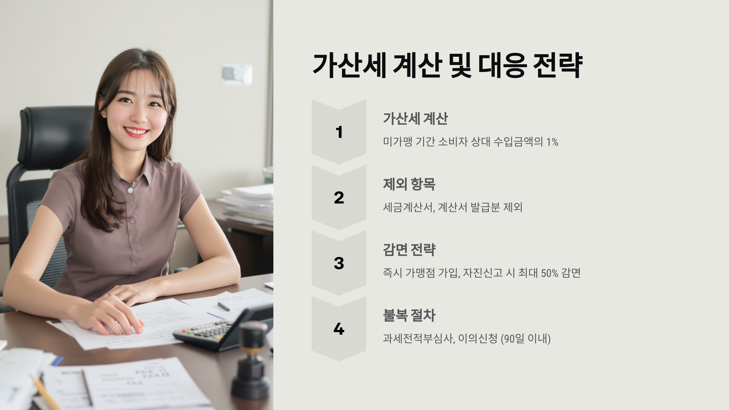 이처럼 가산세는 미가맹 기간 동안의 '모든' 소비자 상대 거래액(카드 포함)을 기준으로 계산된다는 점을 명심해야 합니다. 정확한 계산 방식을 숙지하여 사업 운영에 불이익이 없도록 철저히 관리하는 것이 중요합니다.